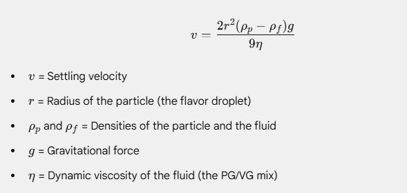 The key takeaway for a manufacturer is that the settling velocity is proportional to the square of the radius (r2). If you reduce the size of the flavor droplet by a factor of 10, you reduce the speed of separation by a factor of 100. If you can move from the micrometer scale to the nanometer scale, the Brownian motion (the random movement of molecules) becomes stronger than gravity, and the emulsion becomes “infinitely” stable.