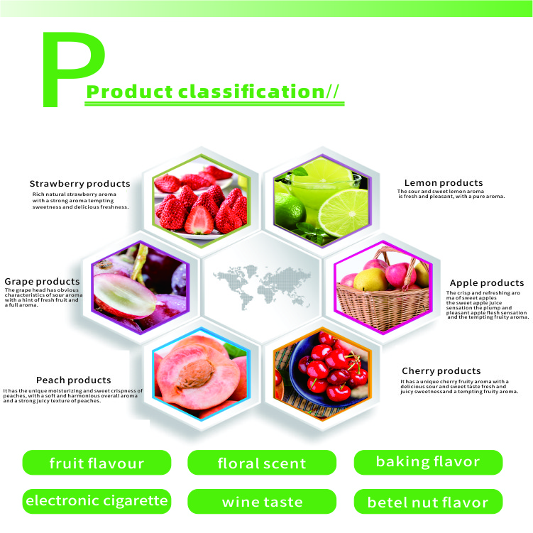 The company has a wide variety of products, which basically covers all the food and drug industries; There are food, fruit flavor, vegetables, tea, dairy, beverage, fried goods, flavoring, health care drugs, high temperature candy, high temperature baking, electronic cigarette flavor and so on. All products can be made into solid powder and liquid oil-soluble and water-soluble products.
