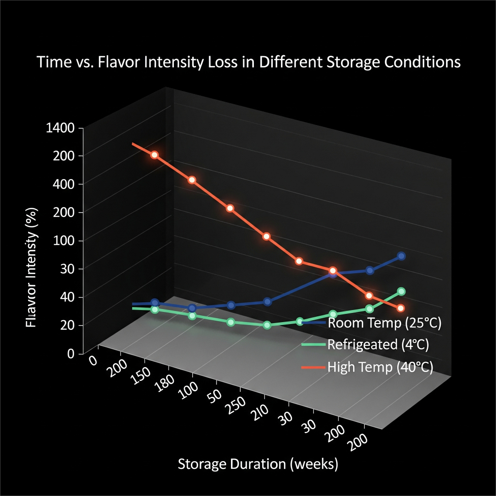 الوقت مقابل فقدان كثافة النكهة في ظروف تخزين مختلفة