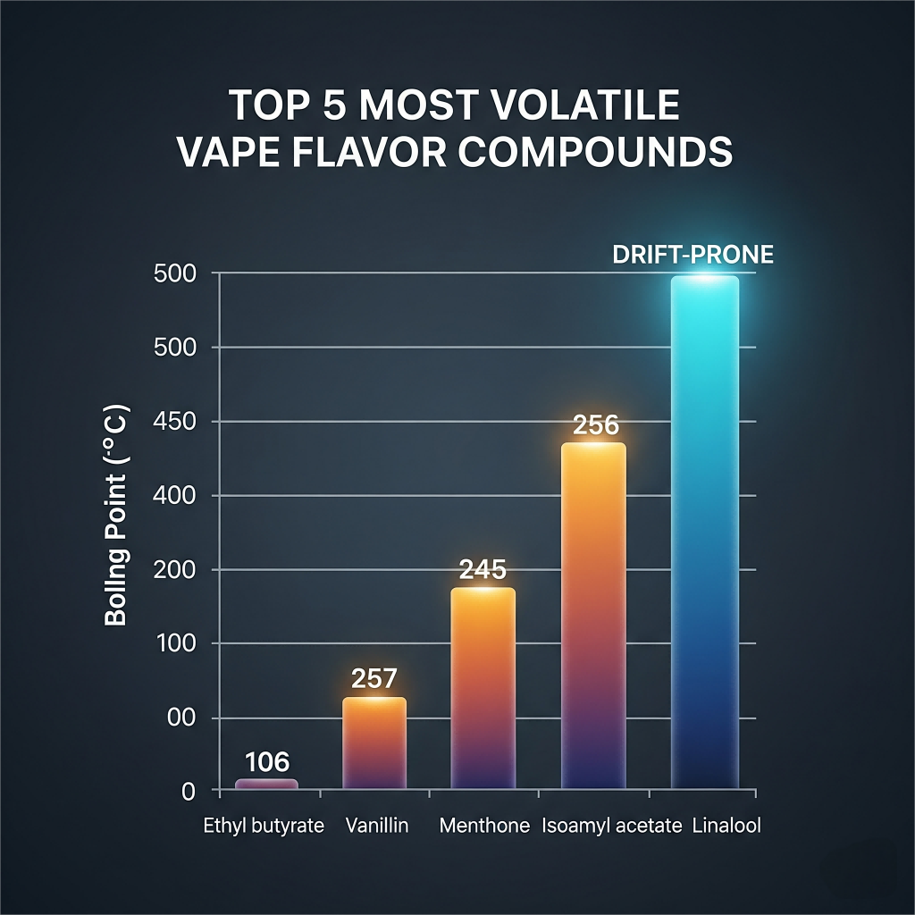العديد من جزيئات النكهة الرئيسية في السوائل الإلكترونية هي مركبات نقاط منخفضة ، بما في ذلك الإسترات (الفواكه) ، الألدهيدات (الحمضيات) ، والكيتونات (الزبد). هذه الجزيئات: