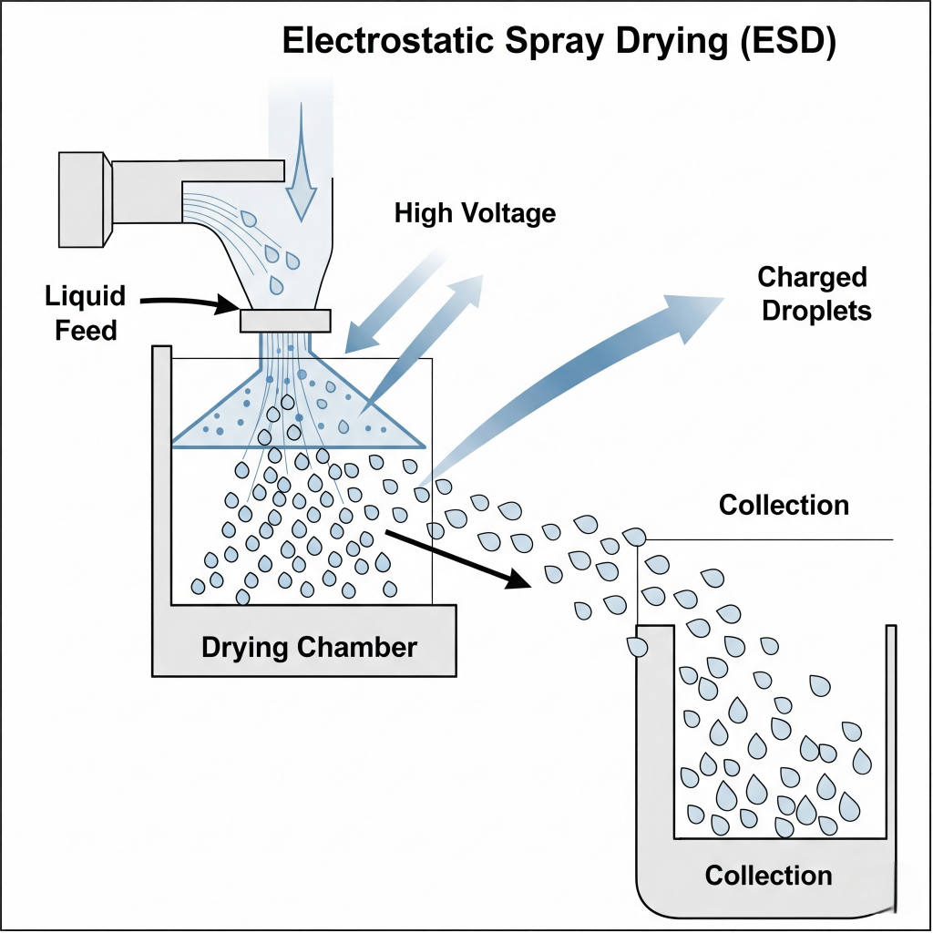 Secado por aerosol electrostático (ESD)es una forma avanzada de secado de pulverización convencional que utiliza un campo electrostático para mejorar la atomización y la formación de partículas. Mientras que los métodos tradicionales dependen de las fuerzas mecánicas, ESD introduce una carga eléctrica, que ofrece un control superior sobre el tamaño y la distribución de las gotas. Esta precisión es particularmente beneficiosa para encapsular compuestos sensibles y volátiles de sabor.