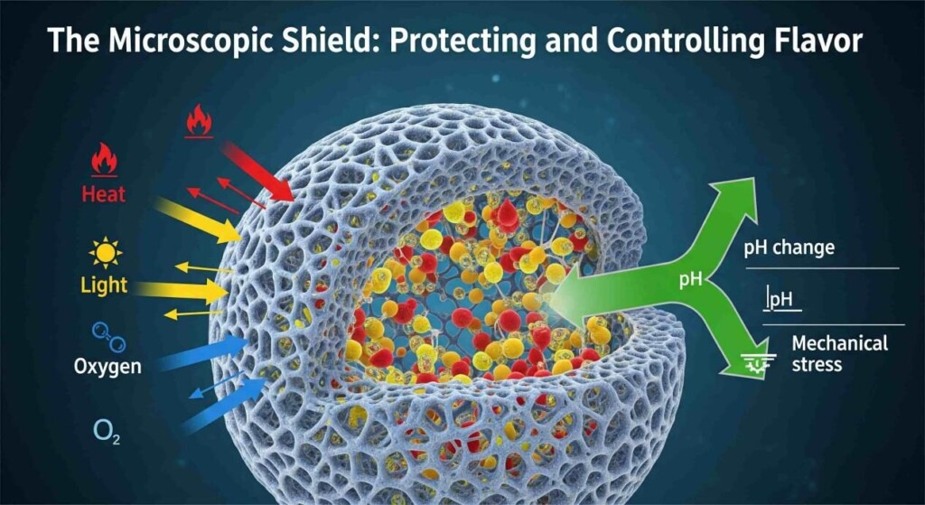 Traditional methods like simple emulsification or spray drying often fail to provide a complete barrier against all these stressors. While a well-formed emulsion can protect against water, it offers little to no protection against oxygen. Similarly, a spray-dried powder can protect against volatility, but the porous nature of the carrier can still allow oxygen to penetrate and cause oxidation. A 2023 study inFood Hydrocolloidshighlighted the limitations of these methods and emphasized the need for more robust, multi-layered encapsulation systems to address these challenges (Reference 1:Food Hydrocoll., 2023, “Advances in Microencapsulation for Flavor Protection”).