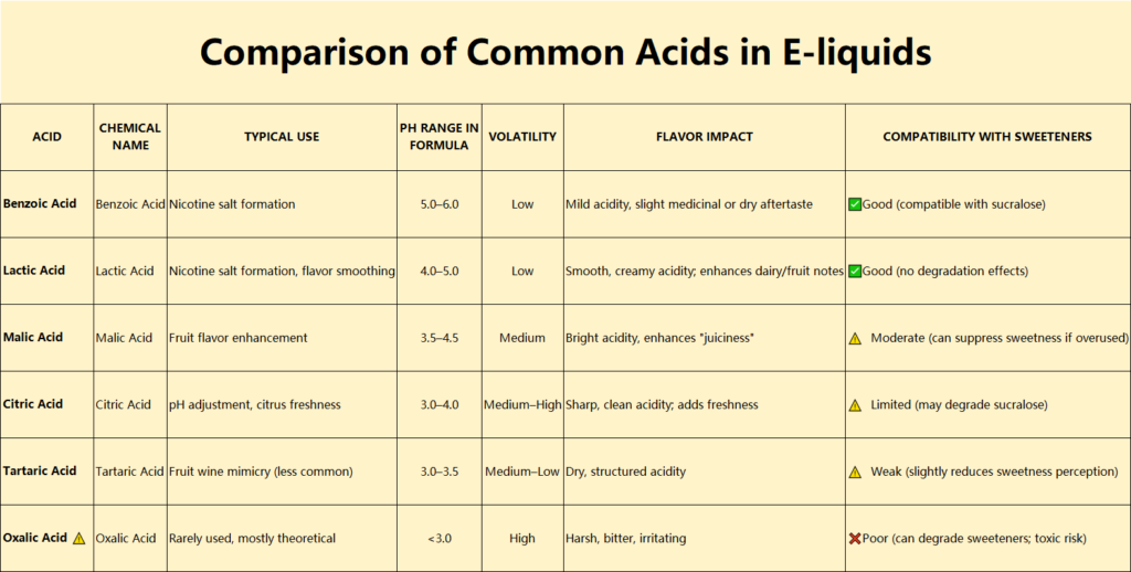 - 相反,过量的酸可能中和甜度,尤其是在扩散速度更快的高PG系统中。