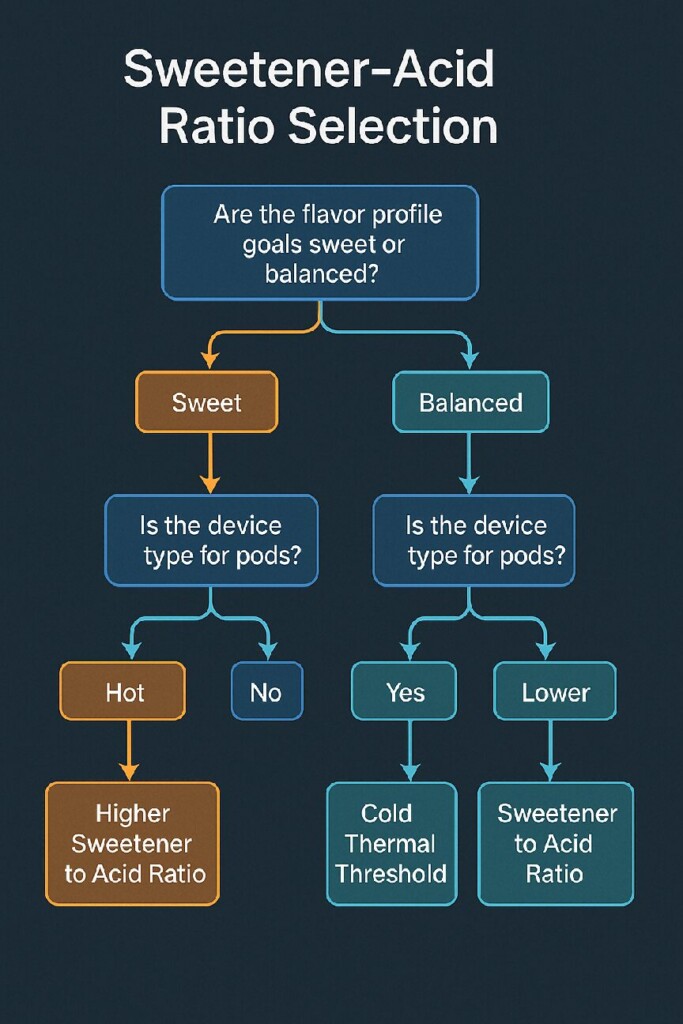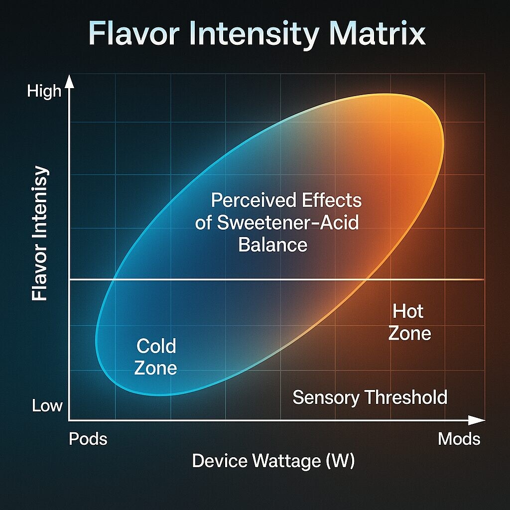 甜味剂和酸不是被动成分。它们会积极改变风味递送,香气释放,甚至在蒸发过程中的风味化合物的热行为。它们的相互作用可以增强,掩盖或恶化所需的风味效应,具体取决于甜味酸对,浓度和所使用的设备的类型。