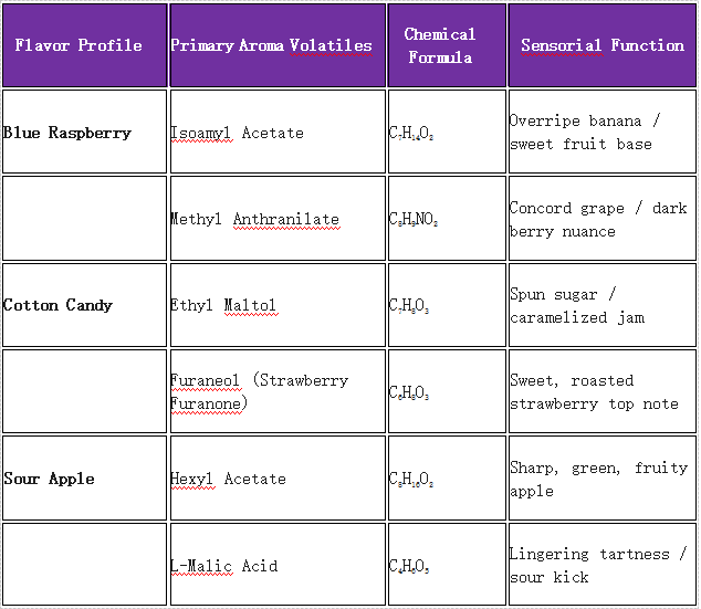 当巧妙地混合后,这些化合物会产生一种果酱味、酸味和多层次的味道,立即在大脑中留下“Blue Razz”的印象。
